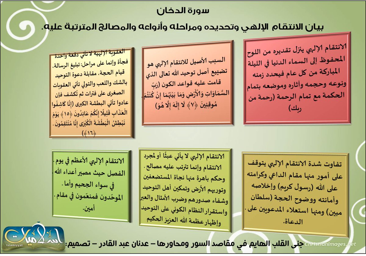 - مقصد #سورة_الدخان: بيان الانتقام الإلهي وتحديده ومراحله وأنواعه والمصالح المترتبة عليه https://pbs.twimg.com/media/Cf8SpOrWQAAGgqA.jpg