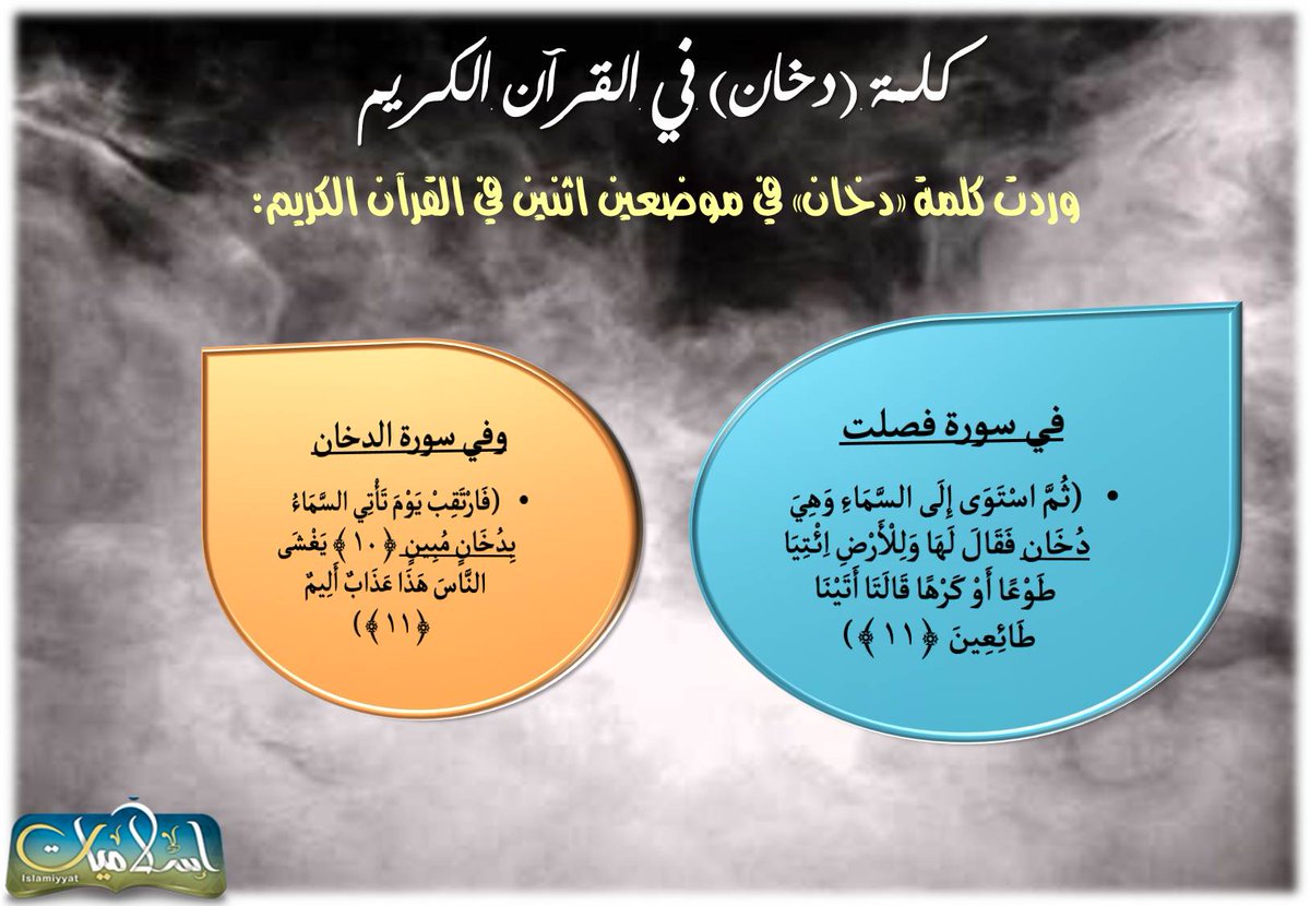 - كلمة (دخان) لم ترد في القرآن إلا في #سورة_الدخان وفي سورة فصّلت https://pbs.twimg.com/media/Cf8TA6qWsAAgXH3.jpg